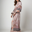 This airy kimono envelops the body with a relaxed, flowing shape. The subtle floral print and muted colours create a refined appearance. The long sleeves and tie belt create a balanced, feminine silhouette. A design that effortlessly exudes charm without being overpowering.